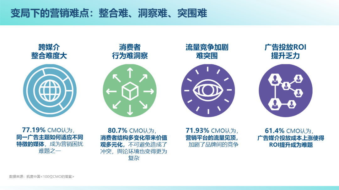 與此同時,政府出臺的反壟斷政策,促進平臺間壁壘逐步被打破,全域營銷時代已全面到來。然而,跨媒介整合難度大、消費者行為難洞察、流量競爭加劇難突圍、廣告投放ROI提升乏力都成為變局下的營銷難點。